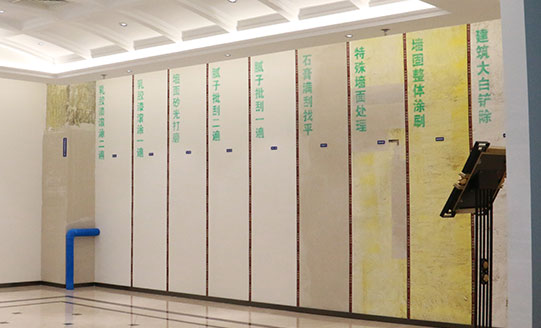 建筑大白鏟除→墻固整體涂刷→特殊墻面處理→石膏滿刮找平→膩子批刮一遍→膩子批刮二遍→墻面砂光打磨→乳膠漆滾涂第一遍→乳膠漆滾涂第二遍