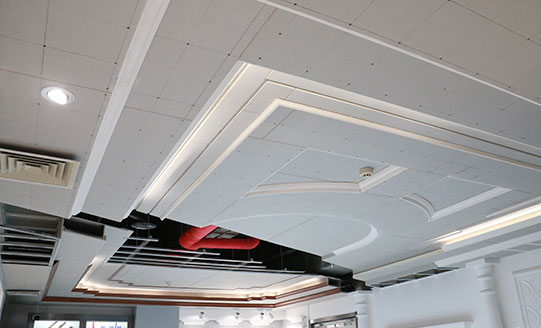 吊頂使用輕鋼龍骨,特殊異性采用局部木龍骨搭配,自攻釘固定,輕鋼龍骨防火防潮,石膏板于龍骨接縫錯開,避免開裂,邊棚拐角T形整板切割防止開裂。